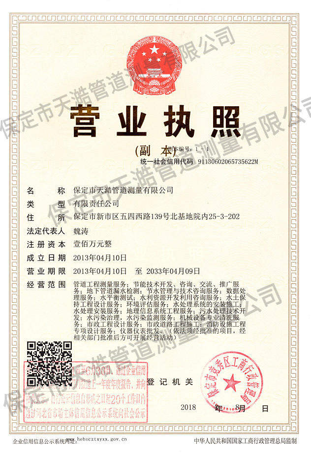 Powerful manufacturer保定市天澔管道測量有限公司是一家專業從事管道工程測量服務;節能技術開發、咨詢、交流、推廣服務;地下管道漏水檢測;管道防腐層探測、管道內窺攝像檢測;DMA分區計量管理;遠傳水表數據采集系統;節水管理與技術咨詢服務;數據處理服務;水平衡測試;冷卻塔熱力性能測試;水利資源開發利用咨詢服務;水土保持工程設計服務;環境評估服務;水處理系統的安裝施工;水處理安裝服務;地理信息系統工程服務;污水處理技術開發,水污染治理,水污染監測服務;機械設備專業清洗服務;市政工程設計服務;市政道路工程施工;消防設施工程專項設計服務;儀器儀表批發的綜合性公司。